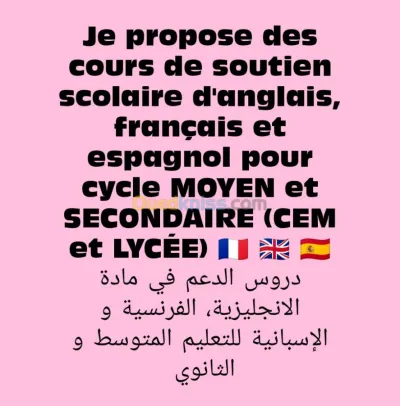 Je propose des cours de soutien scolaire d'anglais, français et espagnol pour cycle MOYEN et SECONDAIRE (CEM et LYCÉE)