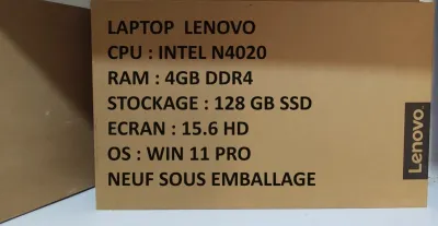 BRA : LENOVO CPU : INTEL N4020 RAM : 4GB RAM DDR4 STO : 128 GB SSD SCR : 15.6 HD OS : WIN 11 PRO PC NEUF JAMAIS UTILISEE SOUS EMBALLAGE VENTE DANS UN MAGASIN