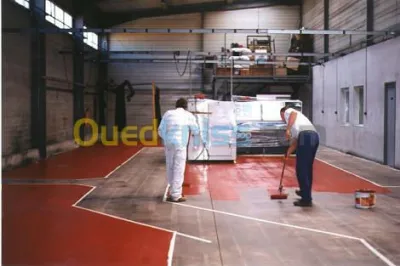 Nos services : **Travaux de rénovation des sols industriels : anti-usure, antidérapante, antistatique anti -poussière, revêtement de sol en époxy. (parking, garage, pompe à