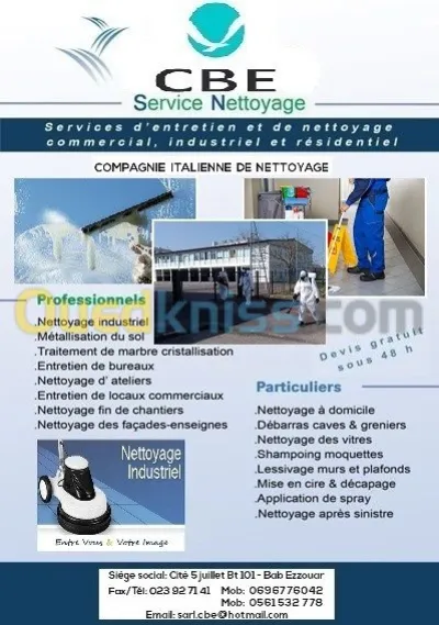 Nettoyage tous types de locaux, nettoyage des hôpitaux, nettoyage d'hôtels, nettoyage des usines, nettoyage des sociétés, nettoyage entrepôts et grandes surfaces, nettoyage de parking,