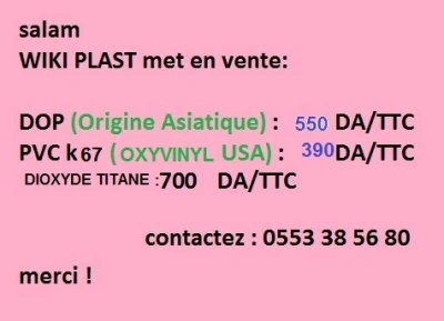 salam DOP Asiatique : 530 DA PVC k67 USA : 360 DA DIOXYDE TITANE Tio2 :700 DA AUTRE MATIERE: STEARATE DE ZINC / STEARATE DE CALCIUM / CARBONATE DE CALCIUM PP / PEBD / PEHD / PS / COLORANT