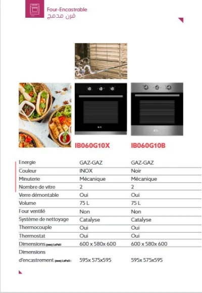 NOIR : 37500 DA INOX : 38500 DA POINTS CLES Volume Cavité 75L Sol GAZ –Grill ELECTRIQUE Control mécanique + Minuterie Thermostat Allumage Intégré Cavité Email