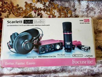 pack complet : 1-Podmice Rode 2-Focusrite Scarlett solo 3-Microphone stand 4-Xlr microphone cable