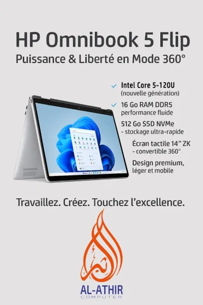 HP Omnibook 5 Flip – Puissance, Flexibilité et Élégance 2-en-1 Découvrez le HP Omnibook 5 Flip, le compagnon idéal des professionnels, étudiants et créatifs en quête de performance