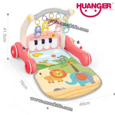 Le pousseur et tapis 2 en 1 de la marque Huanger est un jouet destiné aux enfants dès la naissance. Le tapis est doté d’un bandeau avec des pendentifs colorés en forme d’animaux et d