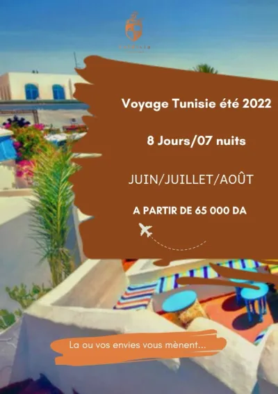 Offre voyages en Tunisie qualité de service garantie 25 ans d'expérience Offre Pack 8 jours 7 nuits Sousse hammamet à partir de 89000 Da triple a partir de 99000 Da double promo ac