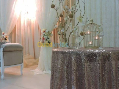- 300 housses de chaises couleur ivoire - 300 noeuds de chaises couleur ivoire et or - 100 noeuds de chaises couleur rose pale et argent - 40 nappes couleur ivoire pour table de 6 - 35
