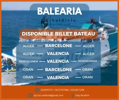 Valdivia Events a le plaisir de vous annoncer la disponibilité de vente de billet maritime avec la compagnie Baléaria aux départs ci-dessous ALGER - BARCELONE - ALGER ALGER - VALENCE - A
