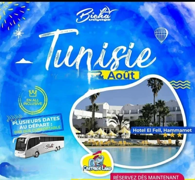 Offre voyages en Tunisie qualité de service garantie 25 ans d'expérience Offre Pack 8 jours 7 nuits Sousse hammamet à partir de 89000 Da triple a partir de 99000 Da double promo ac