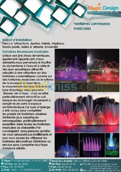 *conception et réalisation de: -Jet d'eau. -Cascade d'eau. -Mur d'eau. -Mur a bulle. -Mur végétal. -Fontaine. -Fontaine sÚche -fontaine musicale. -Lame d'eau -Bassin aquatique.