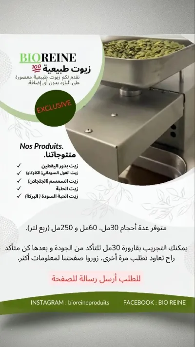 Nous sommes une entreprise privé spécialisé au l'extraction des huiles végétales avec une première pression à froid et Bio à 100% ( sans dilution ), même nous fabriquer aussi les