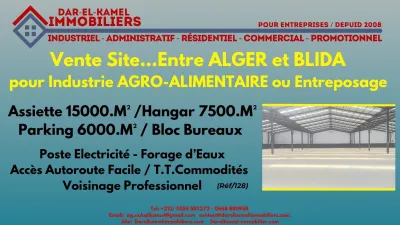Aux environs de BOUFARIK.. Vend un Top site pour INDUSTRIE Agro-Alimentaire ou Entreposage.. Superficie Totale 15000.M².. Top Hangar de 7500.M.. Réalisé suivant les Normes.. Parking 6000.