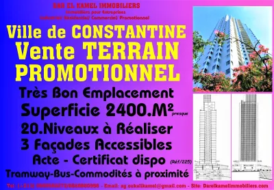 Vend un TOP TERRAIN PROMOTIONNEL aux environ de la Ville de CONSTANTINE... TERRAIN de 2400.M² Presque... Très Bon Emplacement... 20 Niveaux à Bâtir... Parfait pour Promotion Immobilière