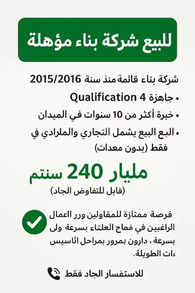 🏗️ À VENDRE : Société de Construction Qualifiée (Qualification 4) 📌 Caractéristiques : Société de construction et travaux publics active depuis 2015 – 2016. Classement pr