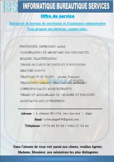 Bureau de travaux de secrétariat, situé à Zeralda offre ses services Nous mettons à votre disposition une gamme de services bureautiques: Traitement et mise en page de textes Saisie et