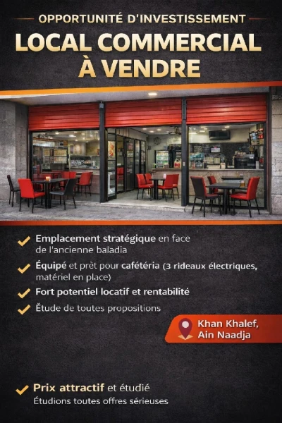 Opportunité d’investissement – Vente local commercial situé dans un emplacement stratégique, en face de l’ancienne baladia, avec fort passage piéton et automobile. Local équipé d