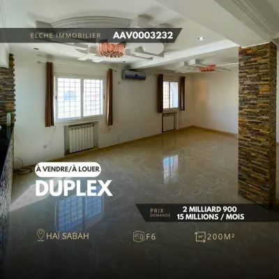 📌 Réf : AAV0003232 🏠 Duplex F6 à vendre & à louer à Haï Sabah – Oran, situé dans un quartier résidentiel sécurisé avec présence d’agents de sécurité. 🔹 Surface : 2