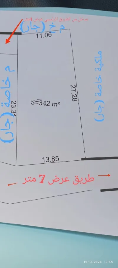 قطعة ارض بمساحة 342 متر مربع منطقة سكانية كهرباء غاز ماء صرف صحي مدخل بلدية الجبابرة طريق واااسع ب 7 امت
