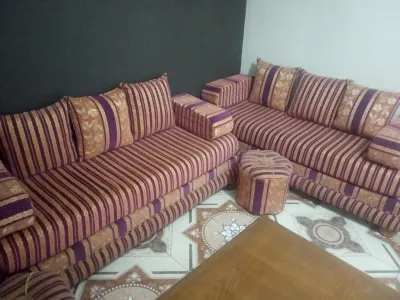 salon 3 lits en bois avec 3 pouffes et une table base, très solide et une bonne finition.صالون 3 كانابيات خدمة سورية متينة، حطب صحيح