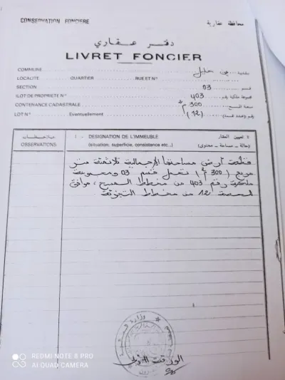 السلام عليكم عندنا قطعة ارض للبيع مساحتها 300 متر مربع صالحة للبناء في وسط السكانين في حي دوار مولود التاب