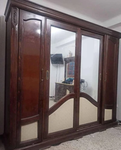 للبيع غرفة نوم حطب احمر بوا روج نوعية اولى رفيعة، حالتها تقريبا جديدة، 4 ابواب 2.5 متر، 2 طابل دو نوي و كواف�