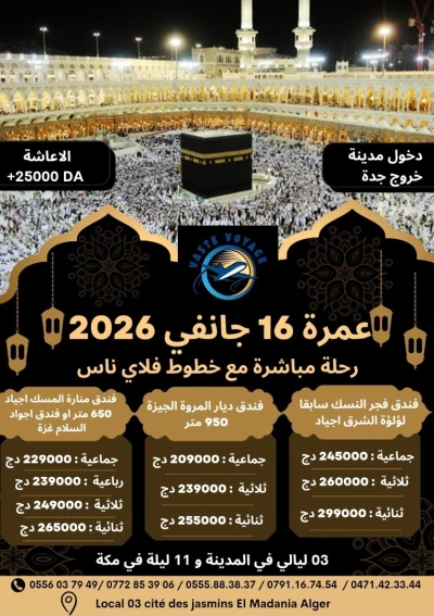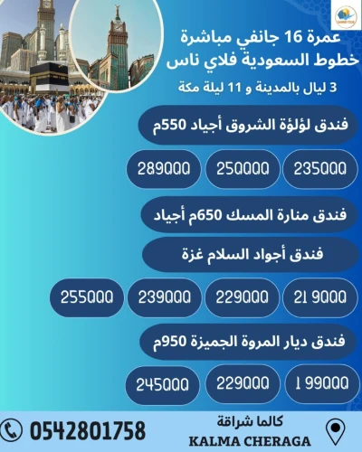 ✨ عمرة 16 جانفي 2026 مع وكالة فاست فواياج ✨ ✈️ رحلة مباشرة مع خطوط فلاي ناس 🇸🇦🇸🇦 🏨 الفنادق والأسعار 1