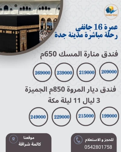 تقترح عليكم شركة تحميد تور عمرة 16 جانفي مباشر مدينة جدة ✅ فندق منارة المسك 650م ․ خماسية 209000دج رباعية 2190