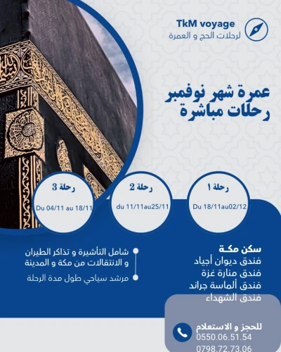 بومرداس ترافل تقترح عليكم عليكم عمرة 2025-2026 -نوفمبر-ديسمبر -جانفي -فيفري (رمضان) رحلات مباشرة مع الخطوط الس