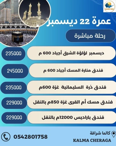 ???? عمرة 19 فيفري مع وكالتكم المفضلة الكسوة للسياحة والاسفار ???? ✨الغرفة الرباعية: 218.000 دج ✨الغرفة الثلاثية : 238