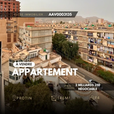 🔹 Réf : AAV0003135 🏡 Appartement F4 à Vendre – Protin, Oran À vendre un appartement F4, situé à Protin – Oran, dans une résidence sécurisée avec ascenseur, caméras de su