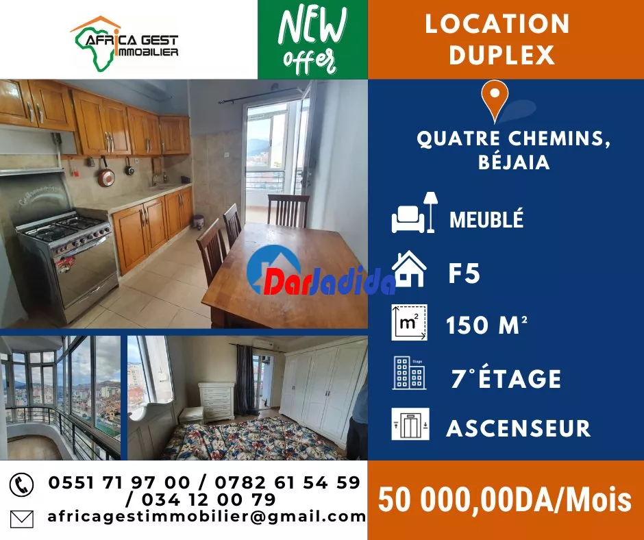 🏡 (Réf : LDM/100) LOCATION – DUPLEX F5 MEUBLÉ | QUATRE CHEMINS – Béjaia, À louer, superbe duplex F5 meublé, propre et bien entretenu, d’une superficie de 150 m², situé au 7�